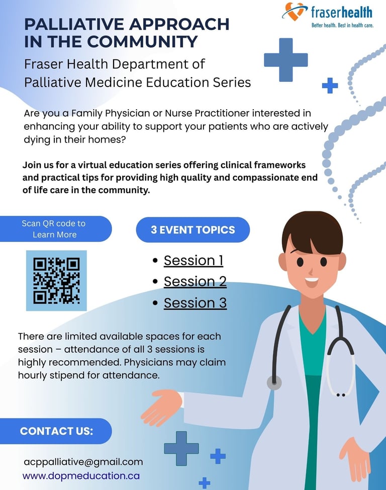 This interactive education series is designed for primary care providers—family physicians and nurse practitioners—who want to strengthen their ability to support patients receiving end-of-life care at home. Hosted by the Fraser Health Department of Palliative Medicine, the sessions combine clinical frameworks with practical, compassionate strategies to guide providers in delivering high-quality care in community settings.